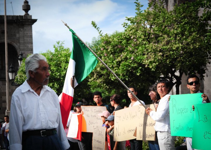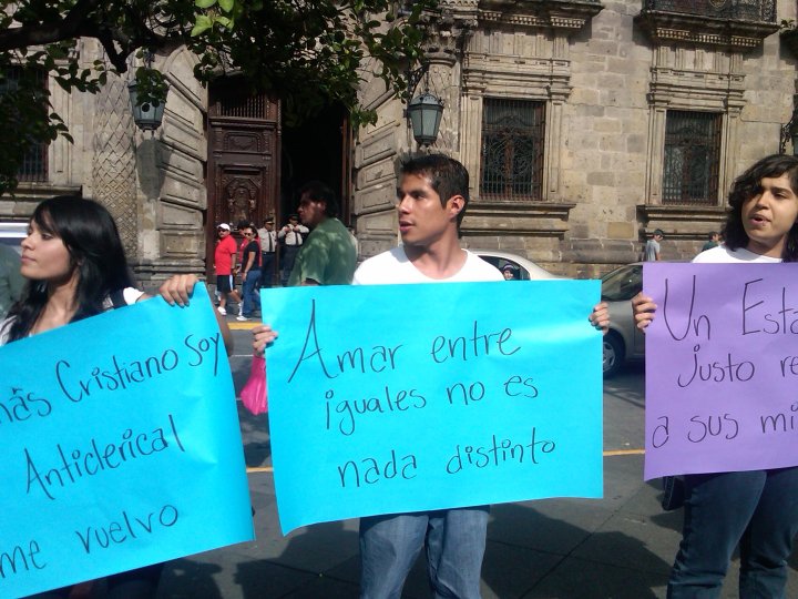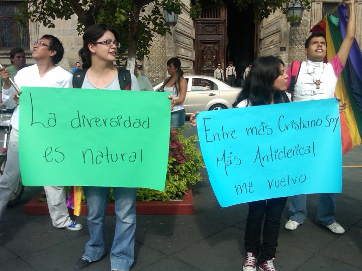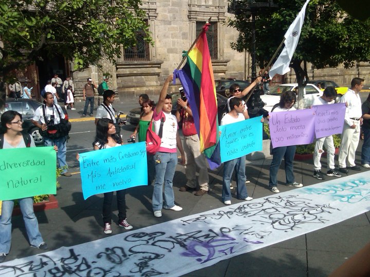 A partir de las 5 de la tarde, un pequeño grupo de activistas de la diversidad sexual comenzó a llegar a la plaza de armas atendiendo al llamado de la concentración pública pro Estado laico. Sorprendidos por la presencia del numeroso grupo de religiosos los activistas formaron una linea para rodear palacio de gobierno acomodandose justo a un lado de el grupo opositor.