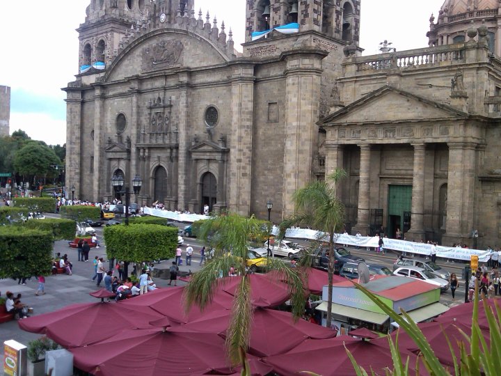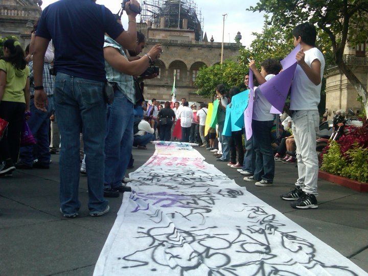 La linea de protectores del estado laico siguió creciendo y creciendo, a las 6:10 de la tarde unas 150 personas sostenian un lienzo de 100 metros de largo que separaba el palacio de gobierno de la catedral de Guadalajara.